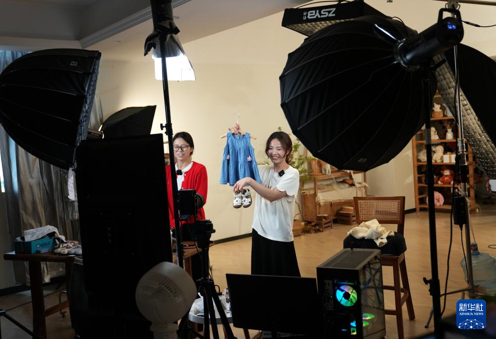 4月13日,在织里镇一家童装企业的直播间内,主播直播推介童装产品。