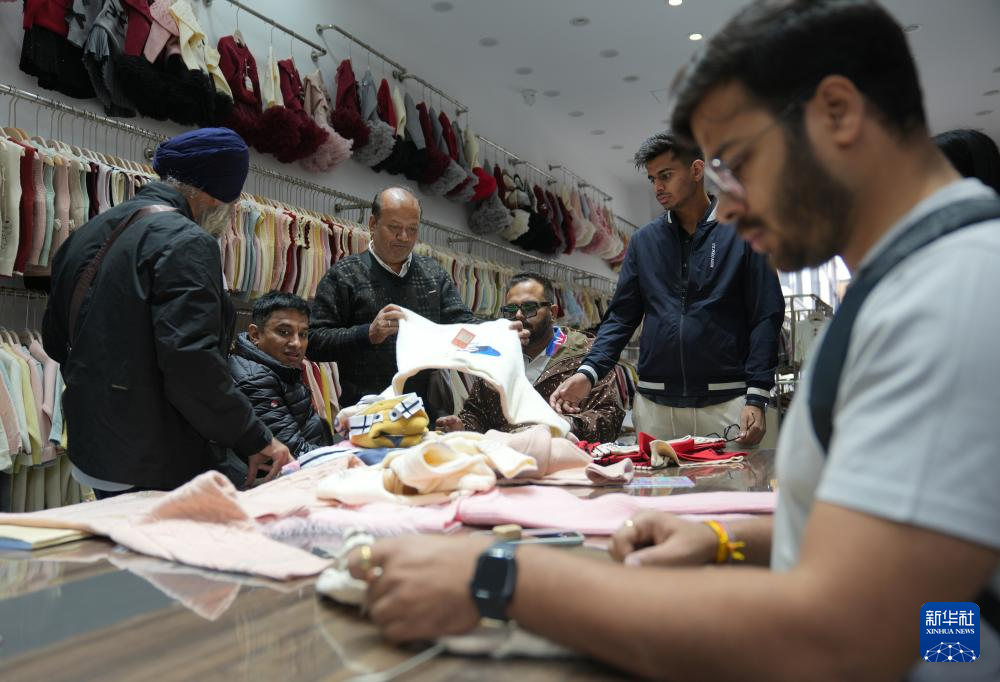 4月13日,几名来自印度的客商在中国织里童装城一家商铺内选购童装产品。