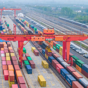 4月14日,在南京铁路物流中心江都物流基地内,大型起重设备将集装箱吊装到海铁联运列车,准备出口(无人机照片)。