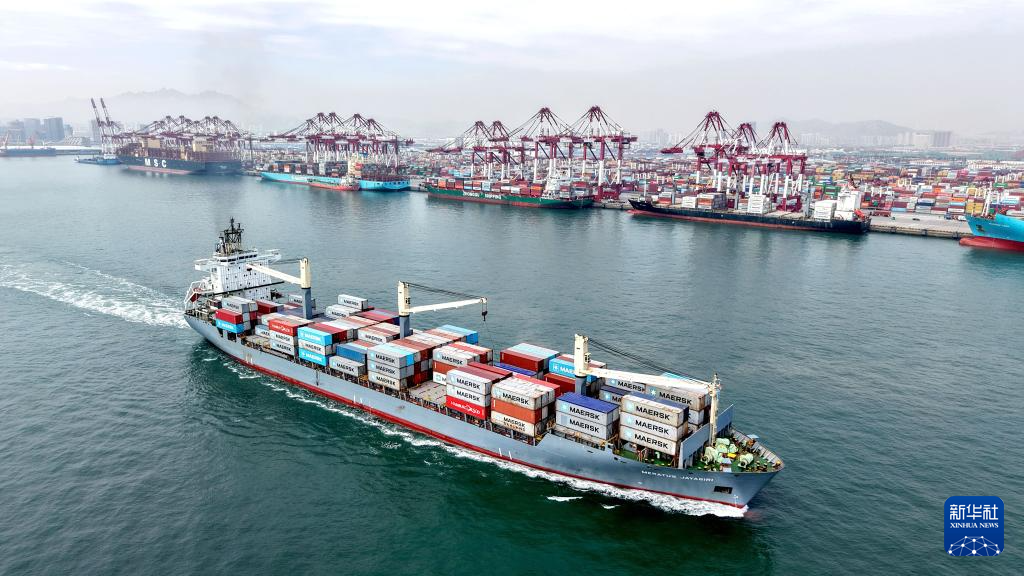 4月14日,在山东港口青岛港,装载外贸集装箱的货轮驶离港口(无人机照片)。
