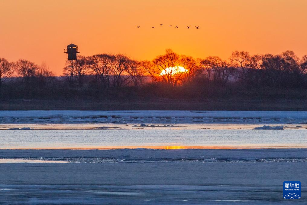 4月14日,在黑龙江干流嘉荫段,朝阳下的流冰与飞鸟相映成趣。