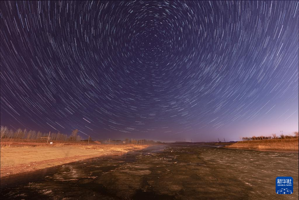 这是4月14日在松花江哈尔滨段一处水域拍摄的星空下的流冰景观(堆栈合成照片)。