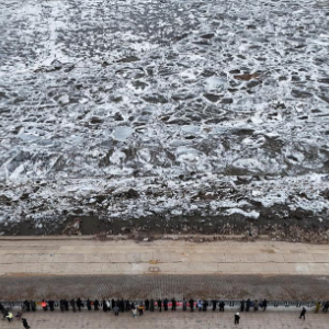 4月13日,人们在观赏松花江干流富锦段流冰景观(无人机照片)。