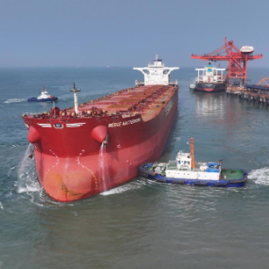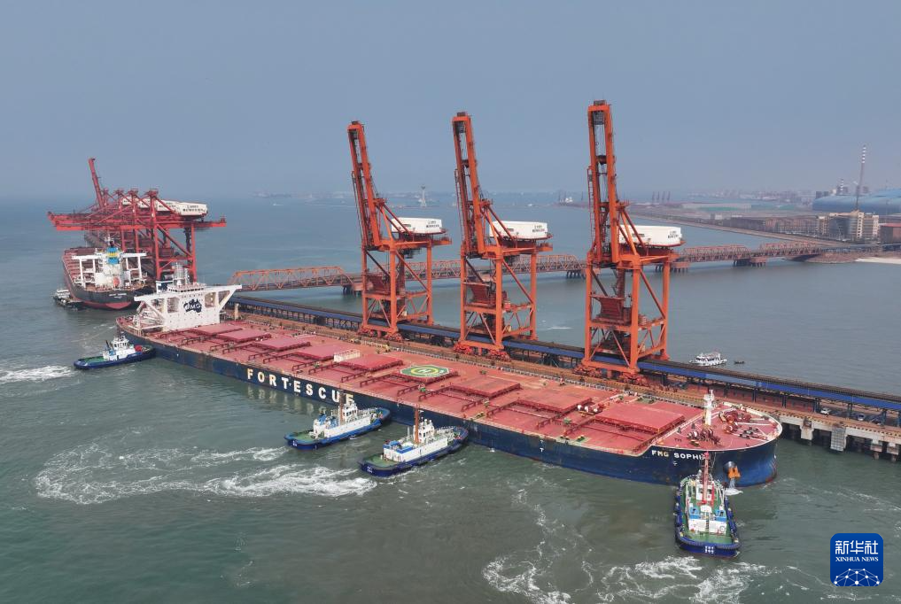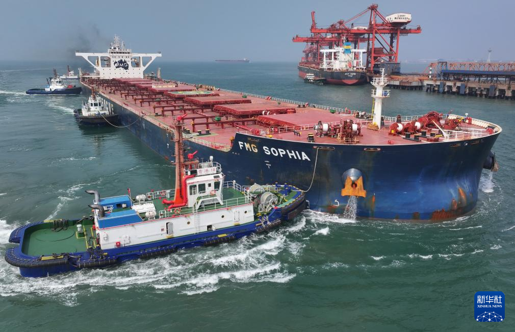 4月15日,一艘轮船在拖轮协助下向唐山港曹妃甸港区矿石码头靠泊(无人机照片)。