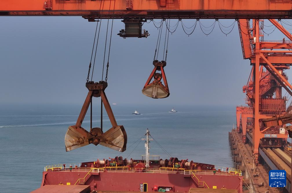 4月15日,一艘轮船靠泊在唐山港曹妃甸港区矿石码头卸载(无人机照片)。