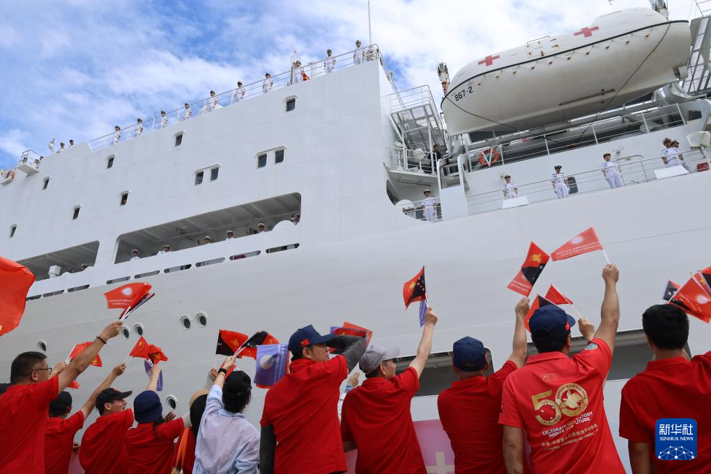 4月15日,执行“和谐使命-2025”任务的中国海军“丝路方舟”号医院船离开巴布亚新几内亚莫尔兹比港。这是码头欢送仪式。