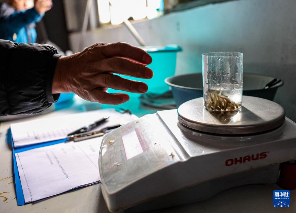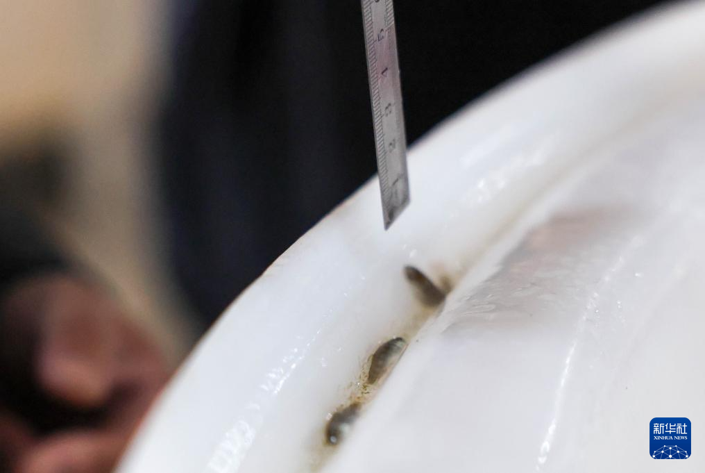 4月15日,工作人员在吉林延边马苏大麻哈良种场繁育车间对鱼苗进行检测、计数。