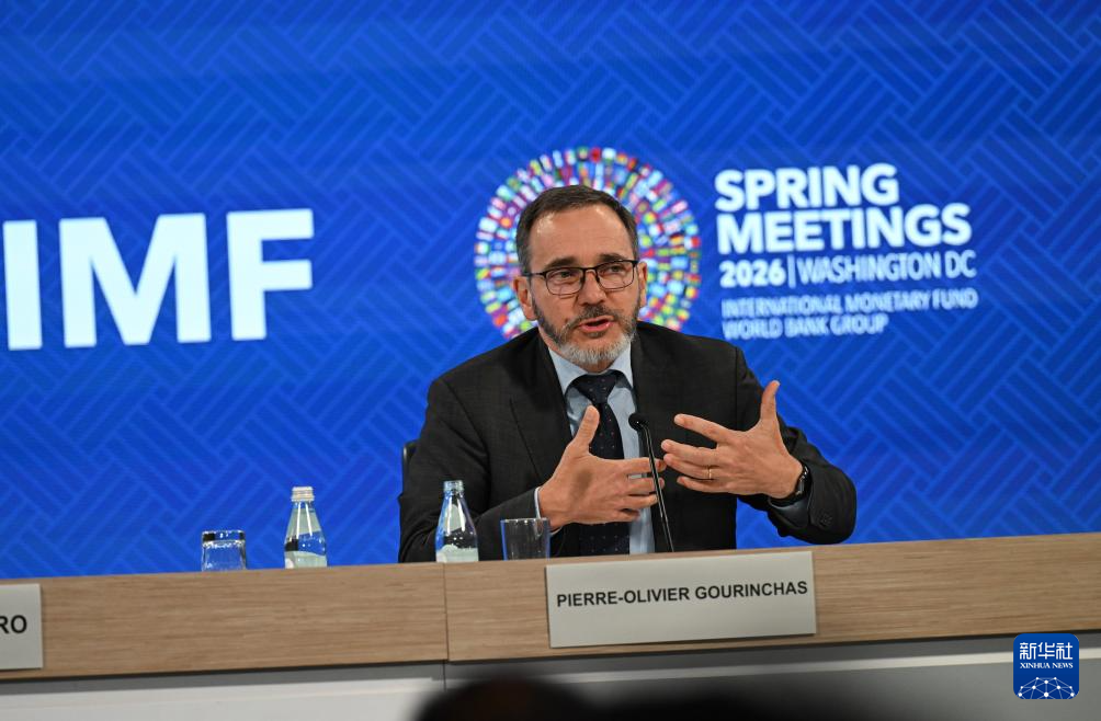4月14日,在美国华盛顿,国际货币基金组织首席经济学家皮埃尔-奥利维耶·古兰沙(中)出席最新一期《世界经济展望报告》的新闻发布会。