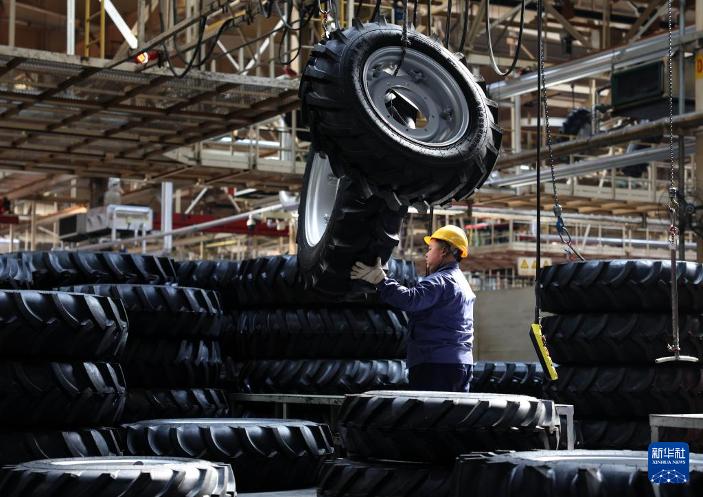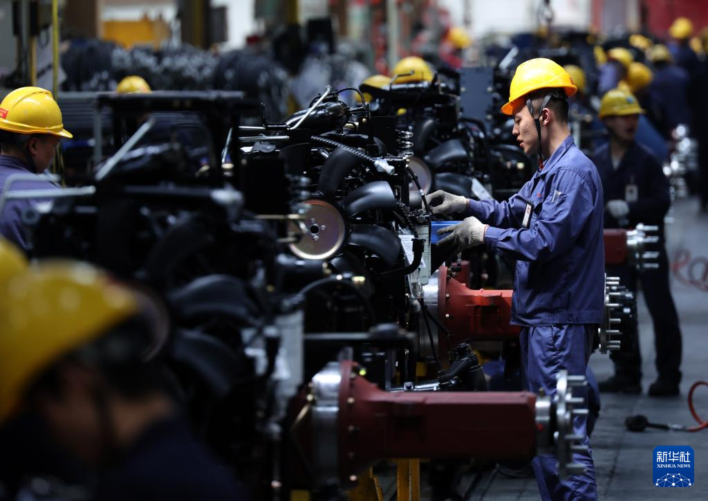 工人在位于河南洛阳的国机集团中国一拖大轮拖总装线作业(2026年4月14日摄)。