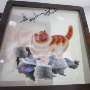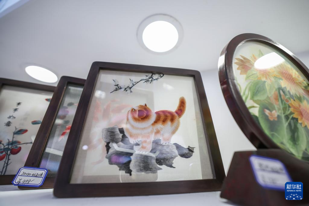 4月14日在第六届消博会上拍摄的湘绣产品。