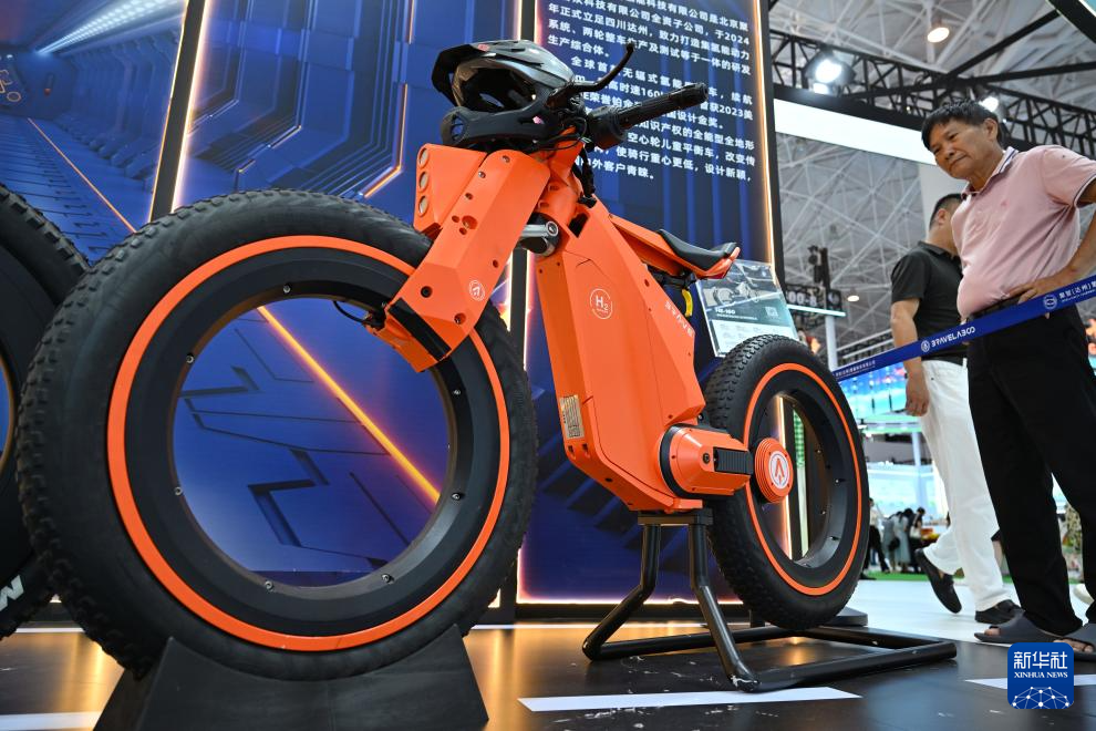 4月15日在第六届消博会现场拍摄的一款国产无辐式氢能摩托车。