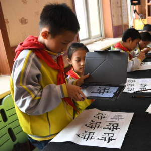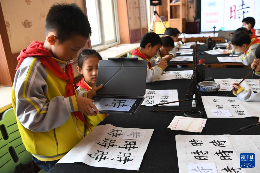 4月15日,北京市第十八中学时光学校学生在书法公开课上使用AI工具分析自己的书法作品。
