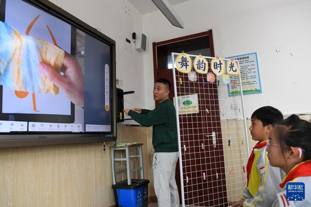 4月15日,北京市第十八中学时光学校教师狄卫晨为三年级学生讲授美术学科公开课《载歌载舞绘心声》,通过AI工具优化图案。