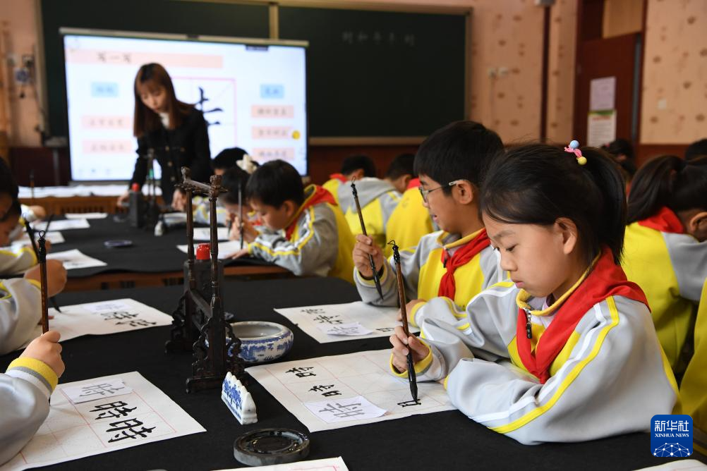 4月15日,北京市第十八中学时光学校学生在书法公开课上练习书法。