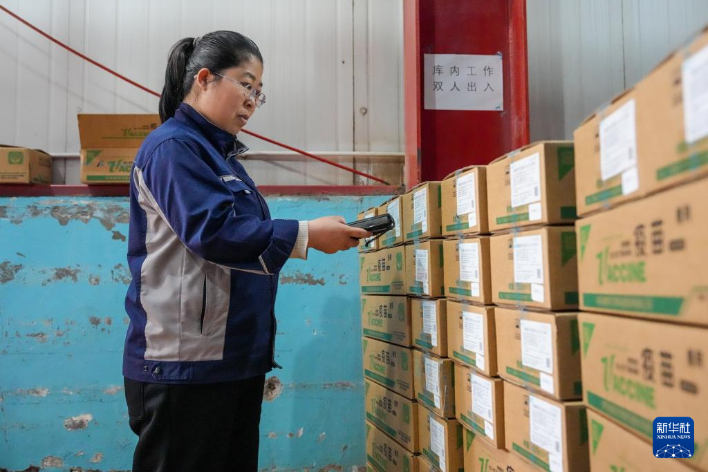 4月15日,在中农威特生物科技股份有限公司疫苗成品库房,工作人员在进行扫码出库作业。