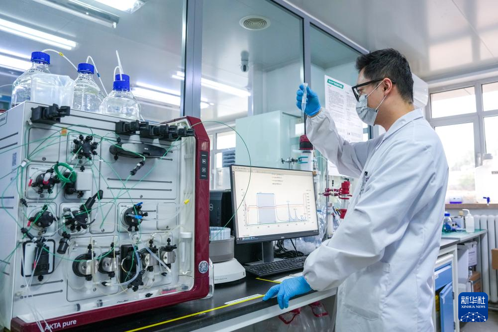 4月15日,在中国农业科学院兰州兽医研究所口蹄疫与新发病流行病学团队实验室,科研人员在进行蛋白纯化作业。