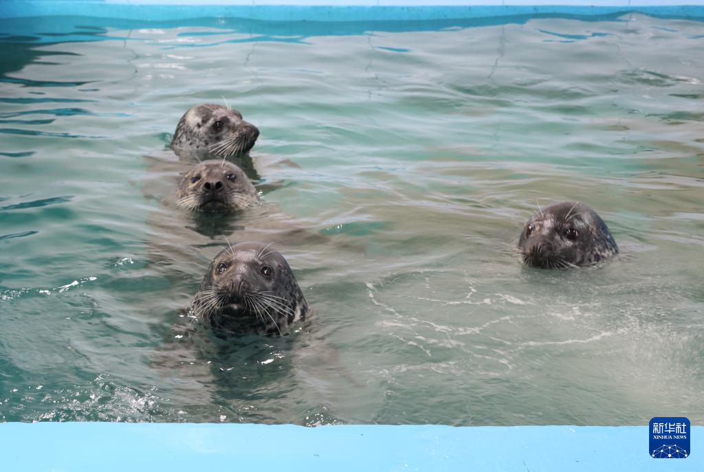 这是4月15日在辽宁省农业科学院所属辽宁省海洋水产科学研究院拍摄的斑海豹,这群被救治的斑海豹因健康状况未达标而无法放归,被安置于一个单独的水池中进行人工饲养。