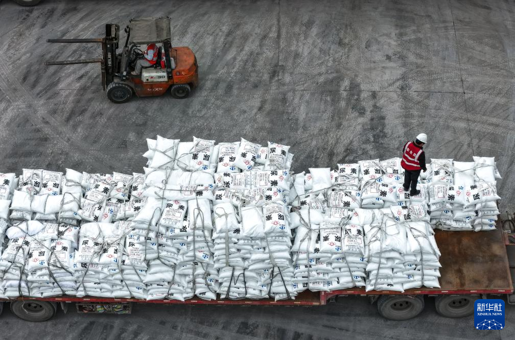 4月16日,在贵州省瓮安县一化肥生产企业,工人将化肥装车(无人机照片)。