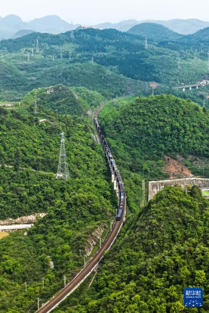 4月16日,运输化肥原材料的列车在贵州瓮马铁路上行驶(无人机照片)。