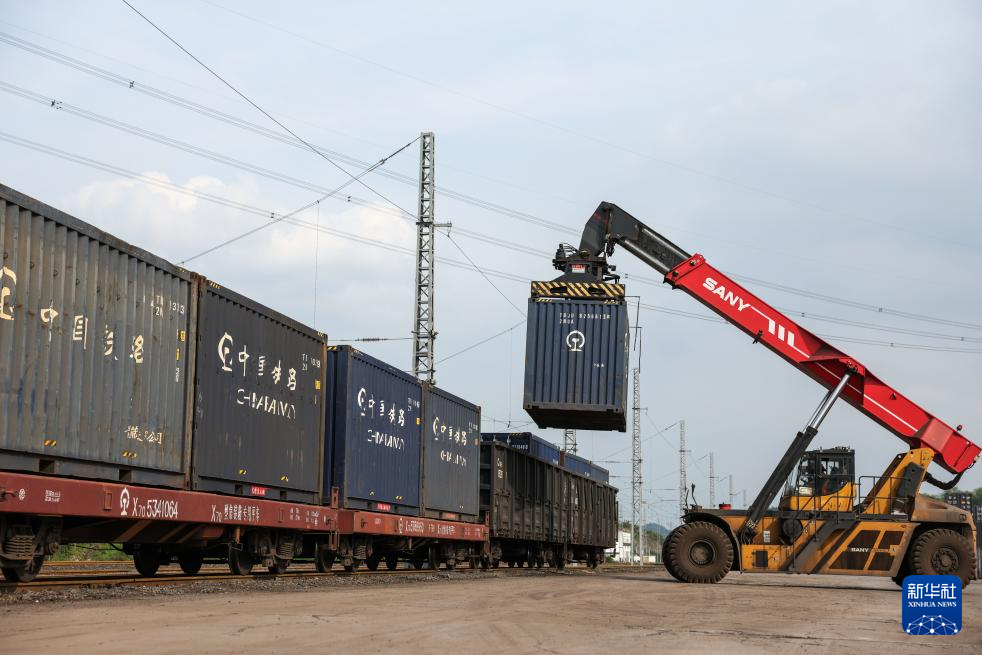 4月16日,在贵州瓮马铁路牛场站,中铁二十局瓮马铁路运营分公司的工人在转运化肥原材料(无人机照片)。