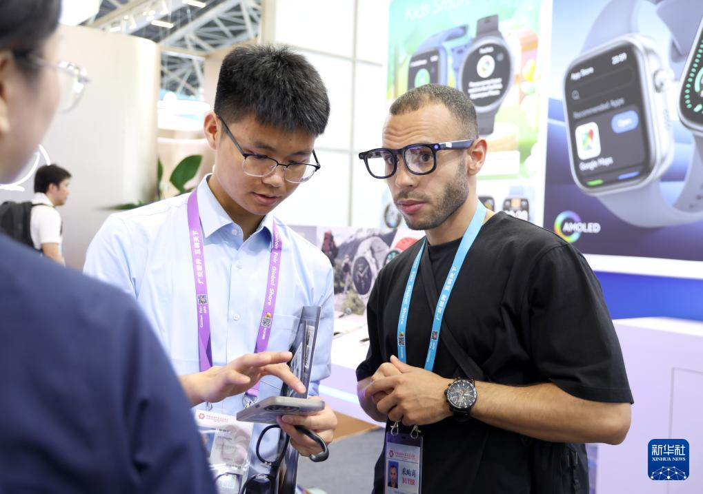 4月15日,境外采购商在广交会智能穿戴展区洽谈。