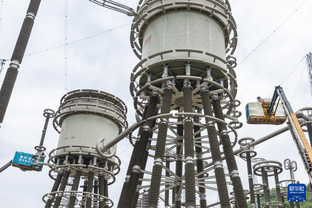 4月15日,检修人员在“疆电入渝”工程渝北换流站换流变进线区域检修。