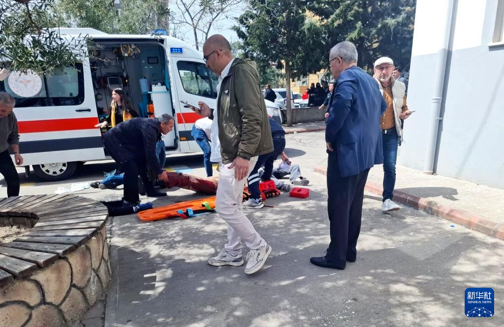 4月15日,在土耳其卡赫拉曼马拉什省一所中学的枪击事件现场,急救人员在抢救受伤人员。