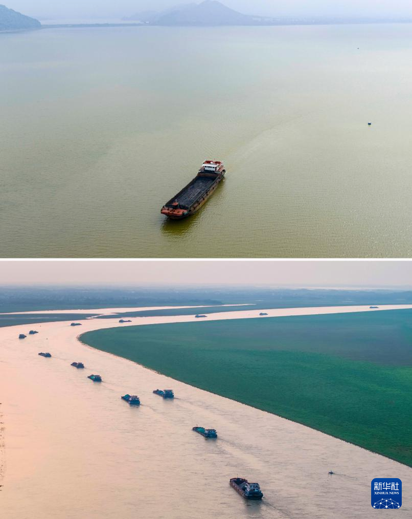 拼版照片:上图为2026年4月17日拍摄的江西省庐山市鄱阳湖落星墩附近水域;下图为2025年12月13日拍摄的江西省庐山市鄱阳湖落星墩附近水域(无人机照片)。