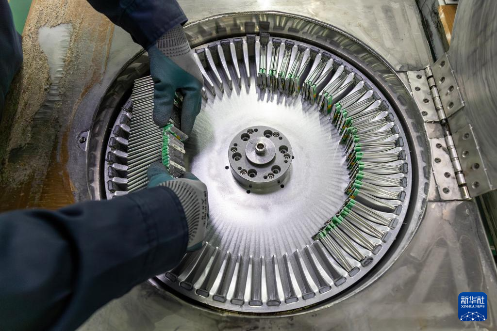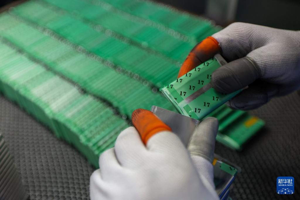 4月17日,工人在贵州省毕节高新技术产业开发区一家新能源电池企业生产车间内生产作业。