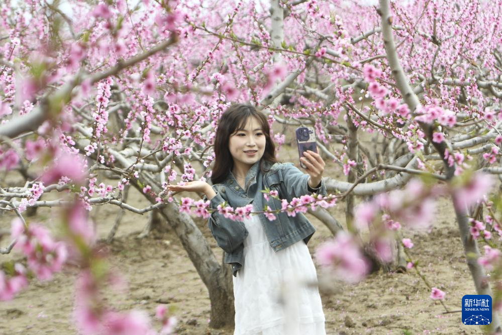 4月16日,游客在甘肃省临夏回族自治州临夏县南塬乡张河西村桃园赏花拍照。