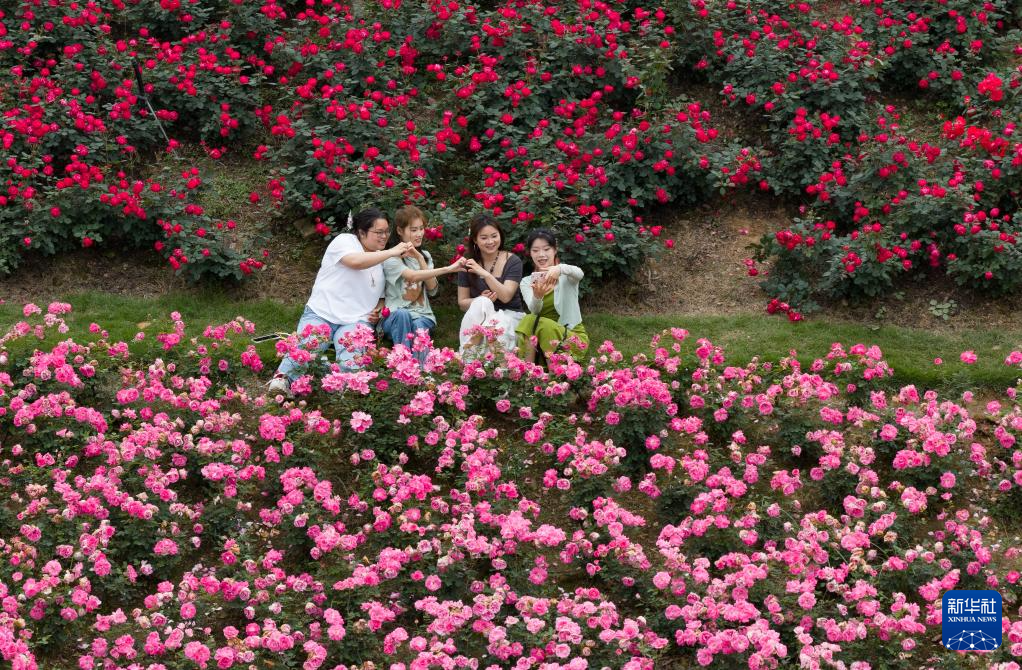 4月15日,市民在四川省宜宾市翠屏区安阜街道岷江花海拍照(无人机照片)。