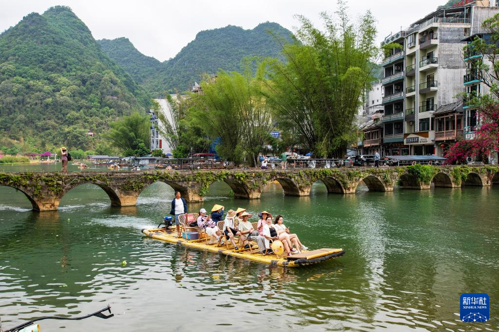 4月17日,游客在广西靖西市鹅泉景区乘坐竹筏游览。
