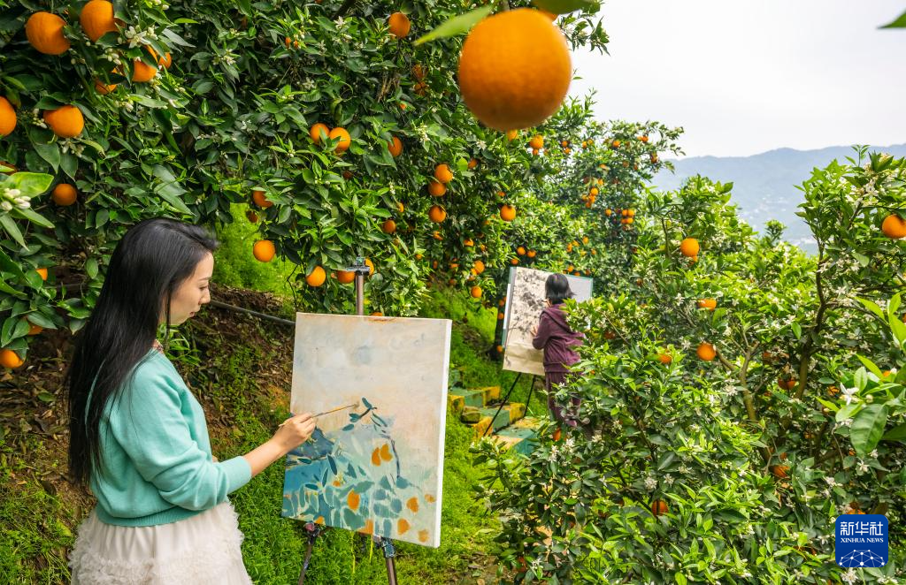 4月15日,人们在湖北省秭归县水田坝乡龙口村橘园里写生。