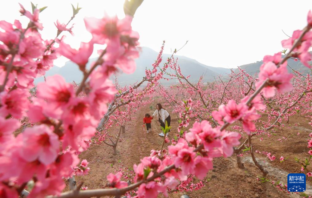 4月15日,游客在河北省遵化市党峪镇下马家峪村桃树园赏花游玩。