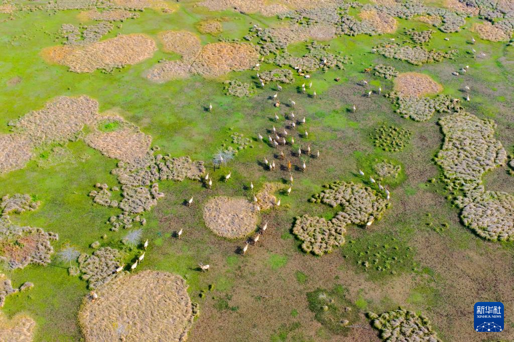 4月15日,麋鹿在江苏东台条子泥湿地栖息觅食(无人机照片)。