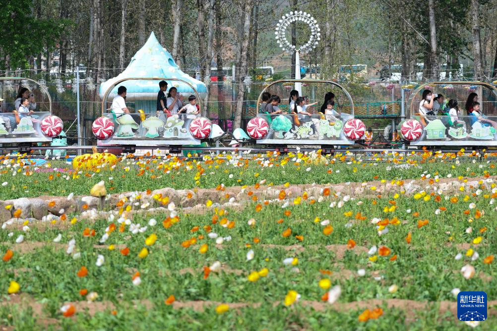 4月18日,在河北省石家庄市灵寿县锦绣大明川露营地,游客乘坐观光小火车赏花游玩。