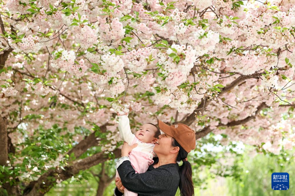 4月18日,在甘肃省兰州市城关区新港城小区内,居民带着孩子赏花休闲。