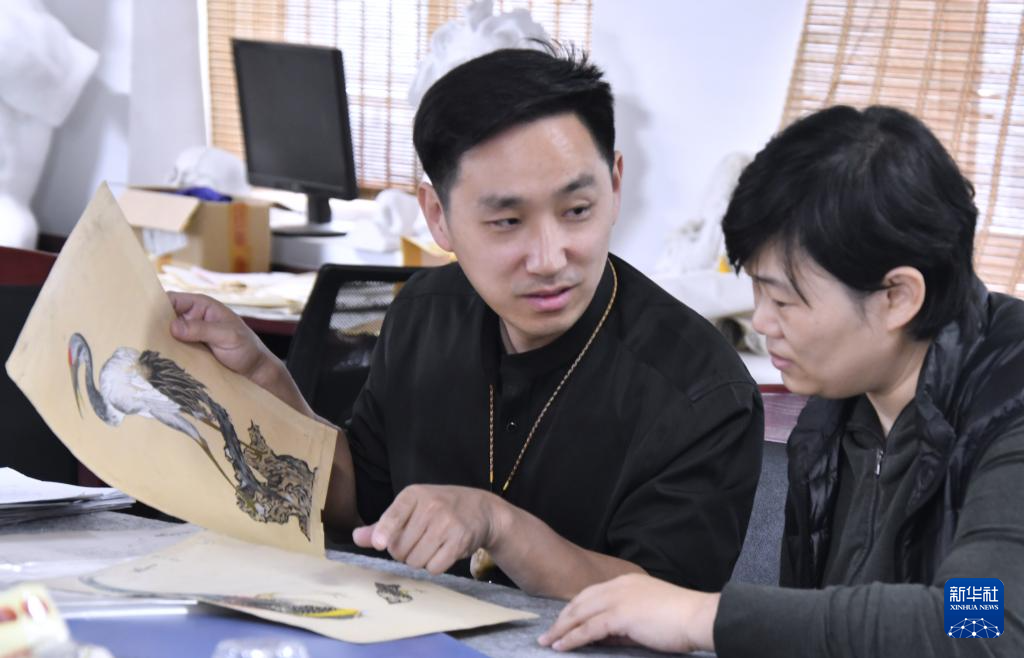 4月17日,张立群(左)在工作室为学生讲解前辈留存下来的玉雕设计图谱。