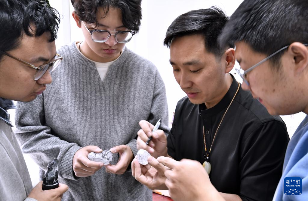 4月17日,张立群(右二)在工作室为学生讲解玉雕设计。