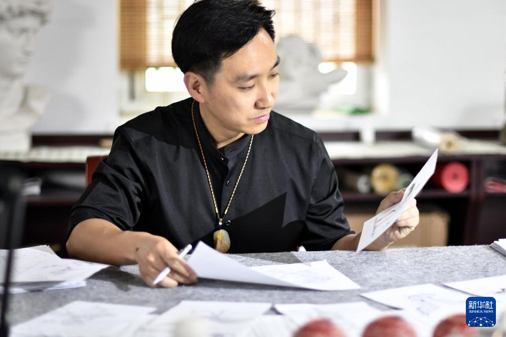 4月17日,张立群在工作室设计玉雕作品。