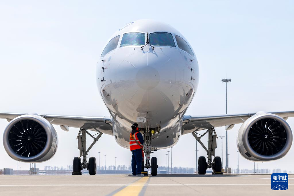 4月15日,工作人员在哈尔滨太平国际机场作业。搭载140名旅客的MU5631航班平稳降落在哈尔滨太平国际机场,东方航空C919国产大飞机哈尔滨—上海航线成功首航。