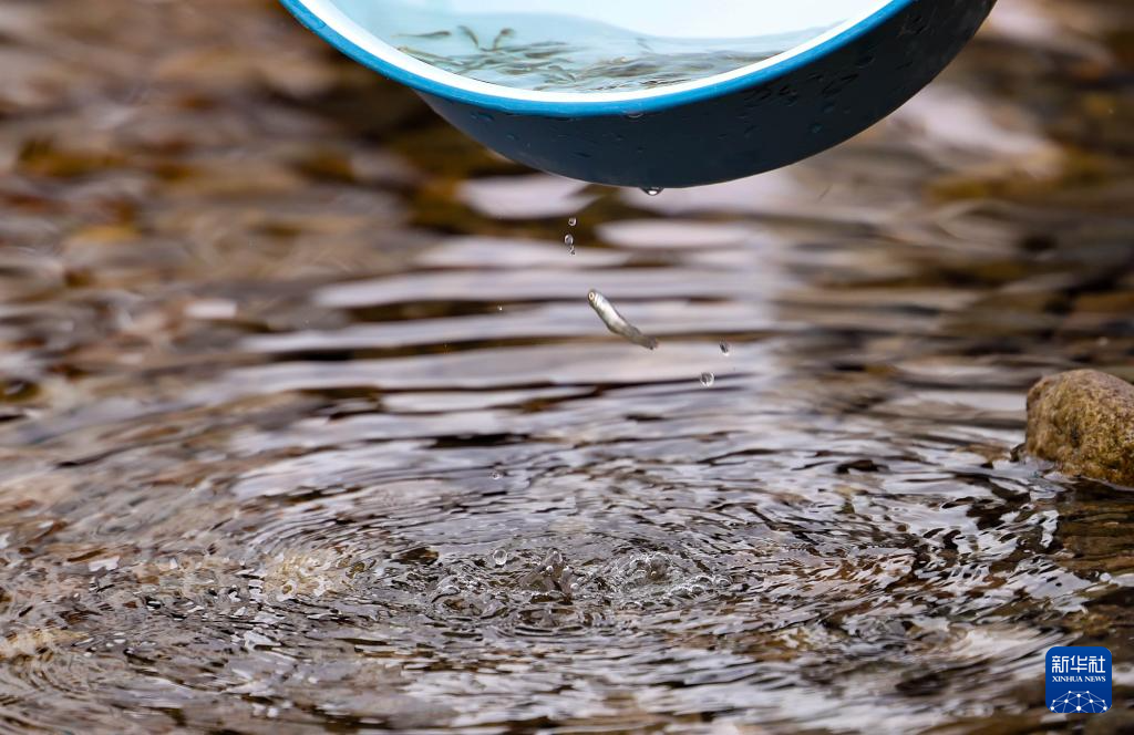 4月15日,在珲春市密江河大麻哈鱼国家级水产种质资源保护区举行的吉林省2026年图们江水生生物资源增殖放流活动上,鱼苗被放流入江。