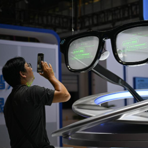 4月10日在第六届消博会主会场拍摄的AI眼镜模型。