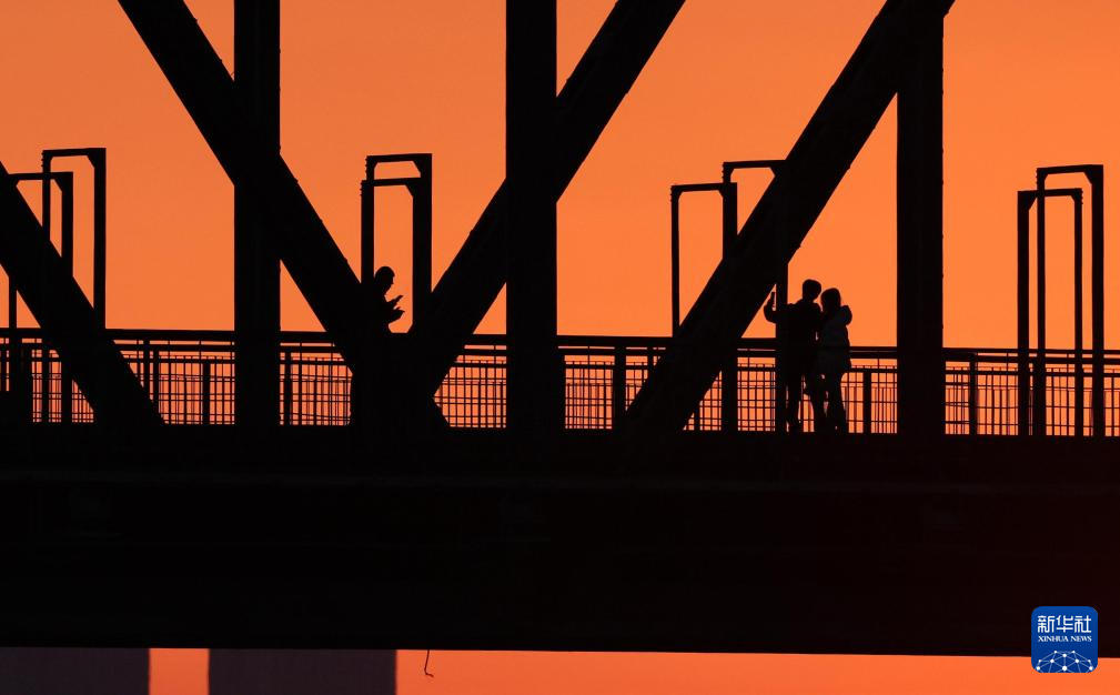 4月11日傍晚,霞光满天,一对情侣在哈尔滨百年滨洲铁路桥上自拍合影。