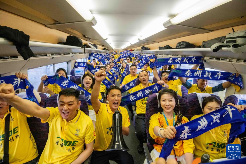 4月18日,球迷们在泰州至徐州东的C9702次列车上为泰州队加油。