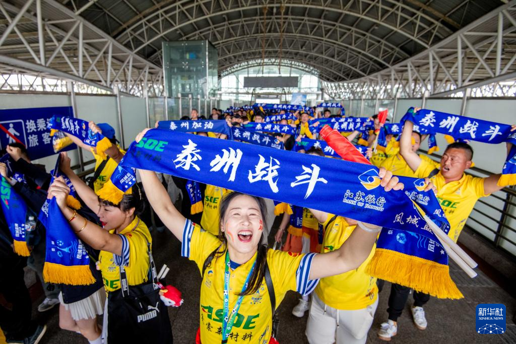 4月18日,球迷在江苏泰州站为泰州队加油。