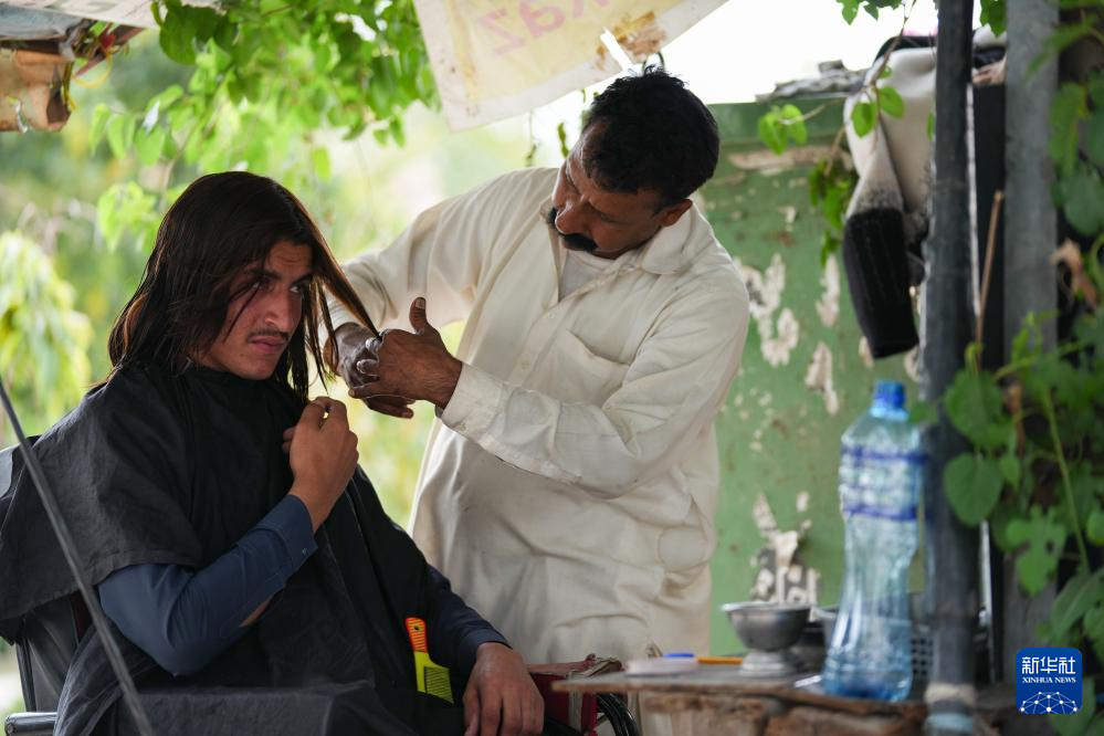 4月17日,在巴基斯坦首都伊斯兰堡,市民在街头理发。