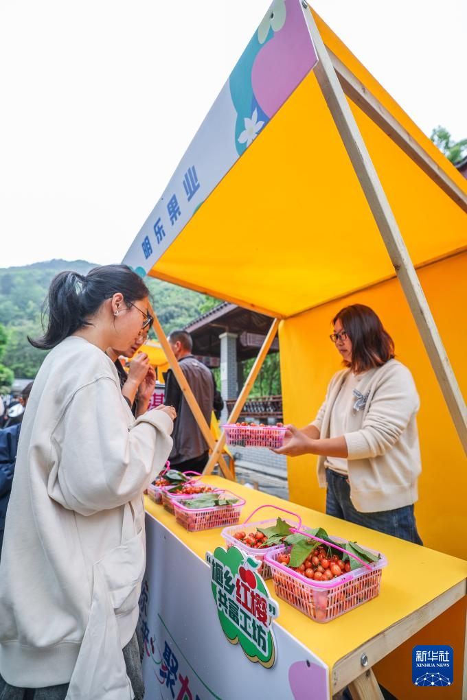 4月18日,樱桃采摘季的共富市集展销赵家镇当地农特产品。