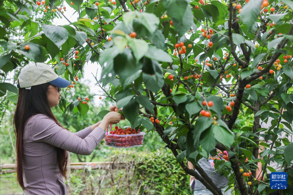4月18日,游客在赵家镇的樱桃园里采摘首批成熟的樱桃。