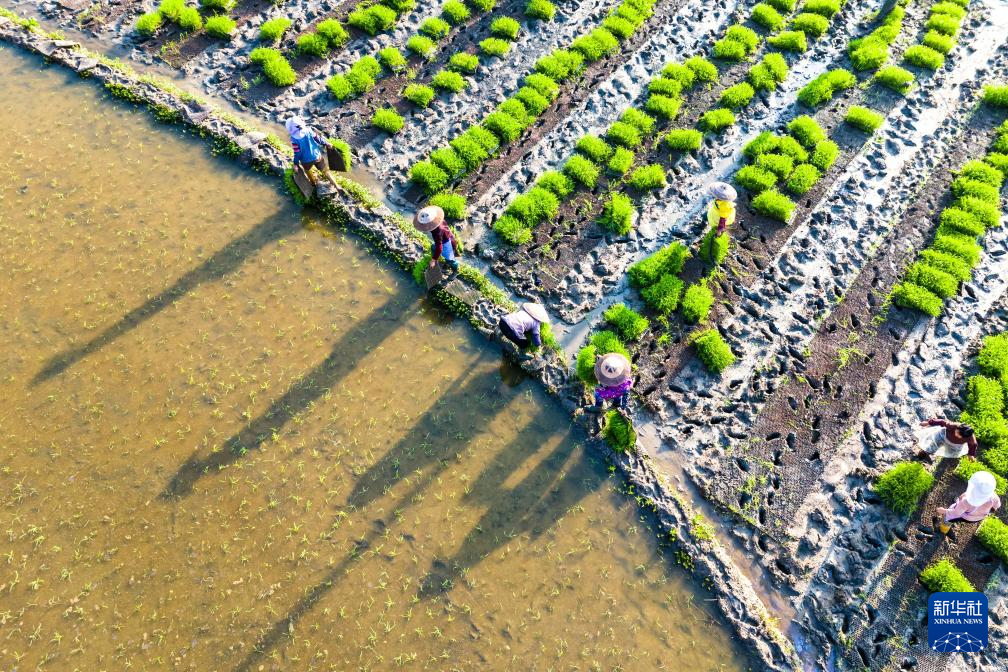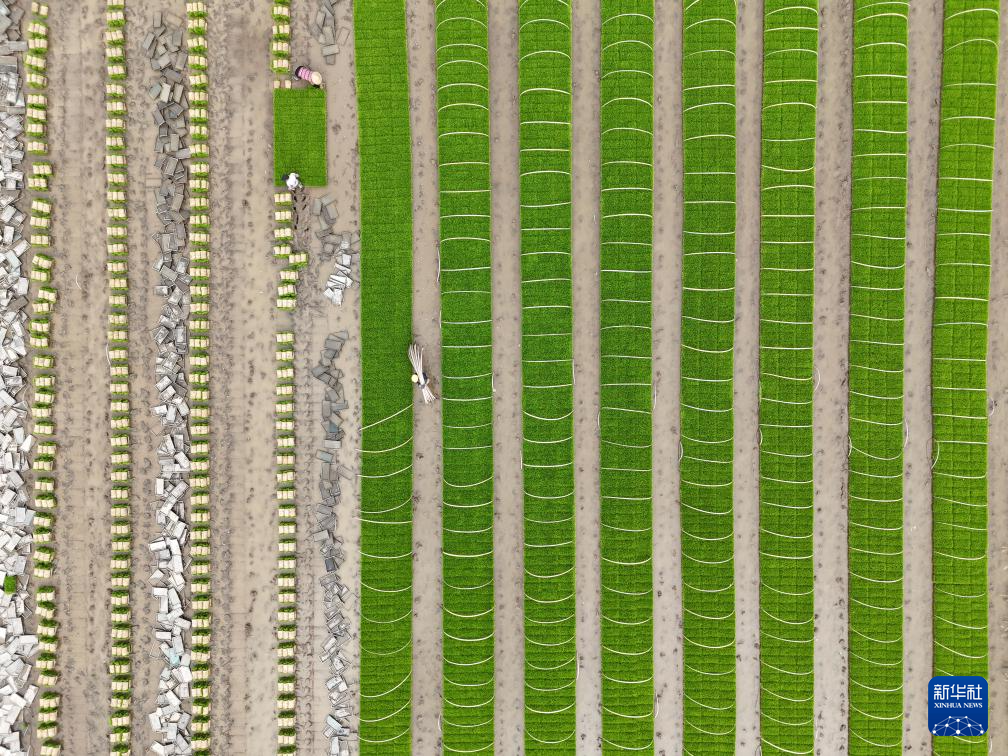 4月19日,湖南省衡阳市祁东县金桥镇农民在起秧苗(无人机照片)。